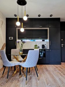Świetnie wyposażona kuchnia w zmywarkę, express do kawy, czajnik, piekarnik z funkcją mikrofali oraz pralko-suszarkę